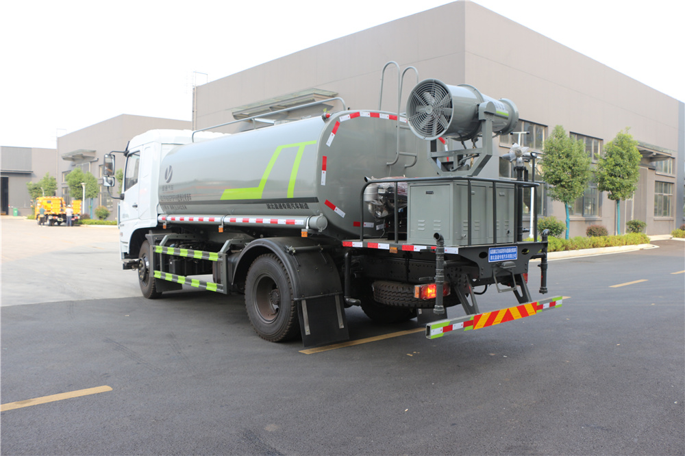 专用功能配置:罐体实际容积约为12立方米,采用武钢优质碳钢板卷压成型。配备专用洒水泵,前喷后洒、侧喷、后工作平台及洒水高压炮。洒水泵自吸高度为6米左右,整车洒水宽度14米左右,后工作平台水炮可调成:直冲状、大雨、中雨、小雨、雾状,有效射程≥28米,整车带消防接头、水位计,自流阀及自吸功能。后工作平台主管路带1寸浇花接口,附送2根3米水管,1个爬梯,两侧及后保险杠。
