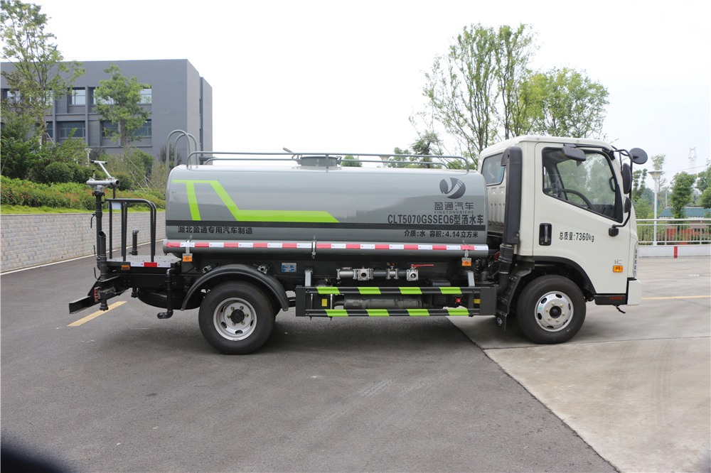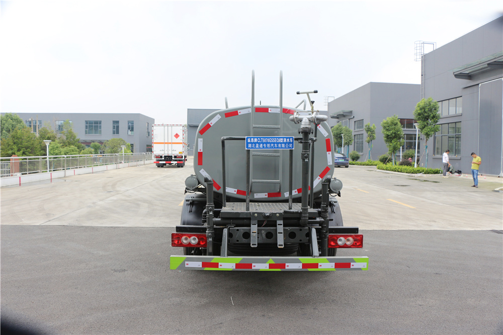 专用功能配置:罐体实际容积为5立方米,采用武钢优质碳钢板卷压成型。配备专用洒水泵,自吸自排,前喷后洒、侧喷、后工作平台及洒水高压炮。洒水泵自吸高度为6米左右,整车洒水宽度14米左右,后工作平台水炮可调成:直冲状、大雨、中雨、小雨、毛毛雨,有效射程≥28米,整车带消防接头、水位计,自流阀及自吸功能。后工作平台主管道带1寸浇花接口,附送2根3米水管,1个爬梯,两侧及后保险杠。