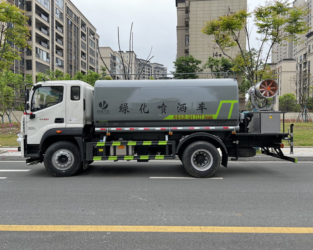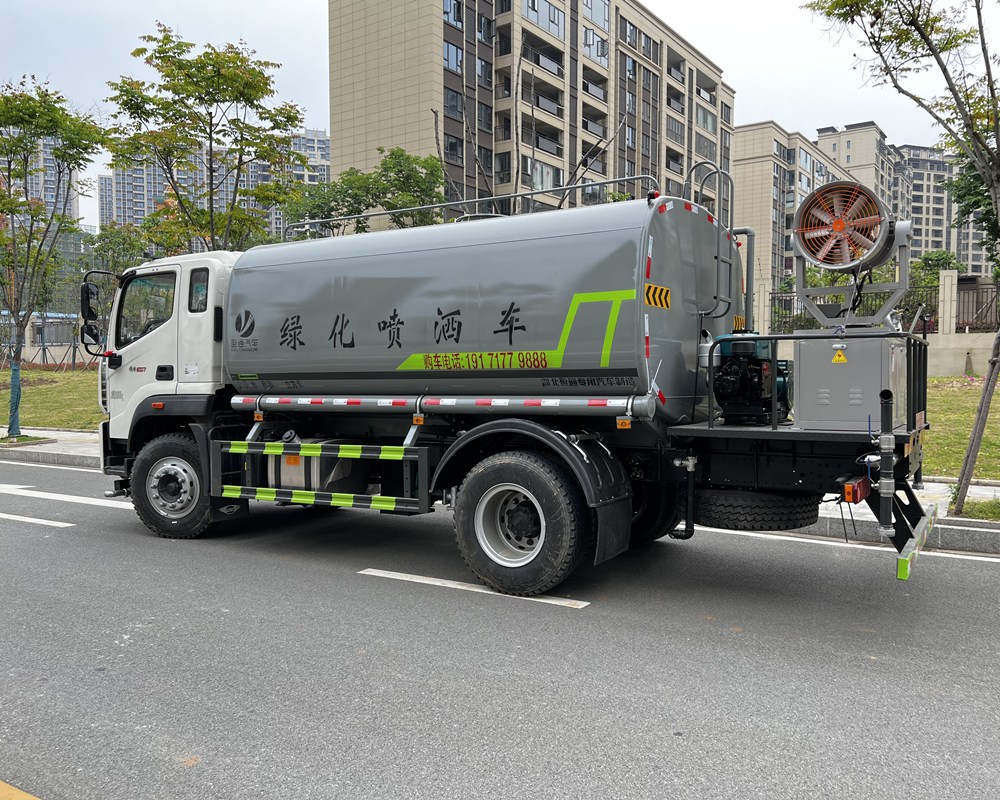 我公司产品标配前喷(鸭嘴)、左右对冲、后洒、侧喷、后置式工作平台,平台上配置绿化水炮(可 360°旋转,既可以调成柱状,也可以调成雾状,更可以调成直冲状、大雨、中雨、小雨、毛毛雨),配备优质大功率专用洒水泵(可自吸自排,可从河里或池塘抽水到罐体),取力器,杂物过滤网,消防接口,自流球阀系统、取力器、球阀、滤网均为标准产品,主管道加粗,法兰垫、法兰盘加厚,大通径球阀。整体具备性能优良安全可靠、效率高、流量大、维修方便等特点。