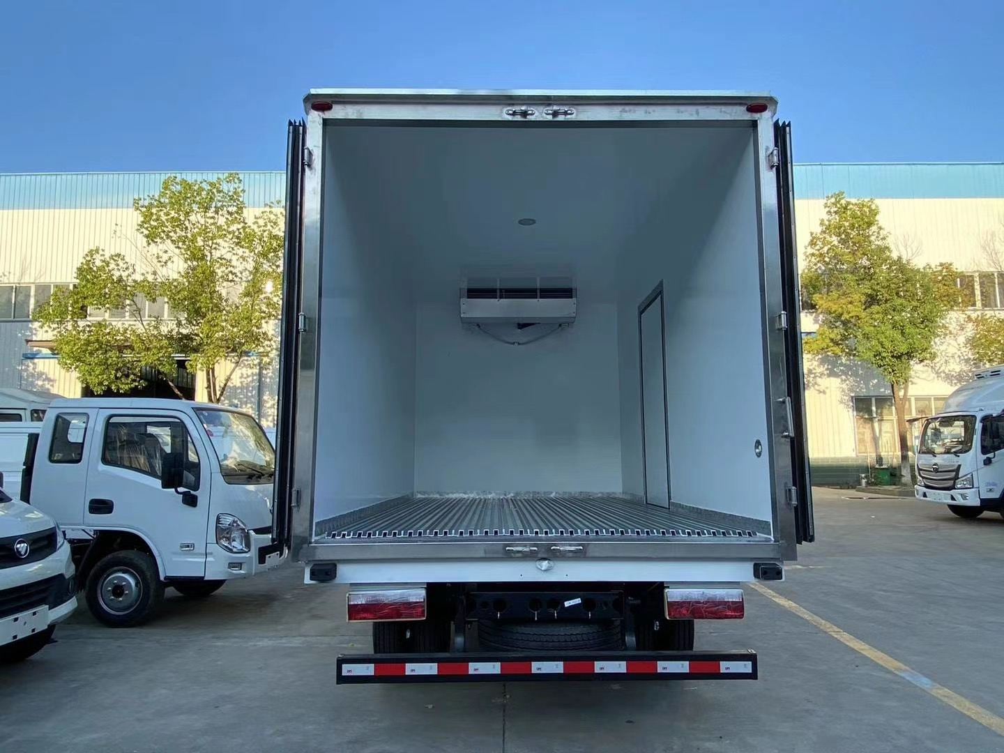 厢板材质:内外壁板选用国内优质玻璃钢(不吸光、隔热性好、硬度强、抗氧化);中间保温层选用8CM厚冷藏专用聚氨酯保温材料。地板采用铝花纹板,门边条采用迷宫式橡胶密封条。厢体配件:厢体周边铝合金包边,不锈钢包角,不锈钢门锁,不锈钢门框及合页,厢体内节能LED照明灯。单开或者双开侧门,肉钩导轨,通风槽,温湿度记录仪。