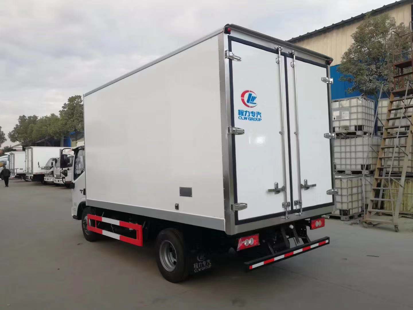 箱体采用的是现在最新工艺《新断桥隔热工艺/整体结构保温厢》内外面料采用 2.5mm厚新式哑光玻璃钢板蒙皮(不吸热),夹心为XPS环保可回收聚氨酯保温材料,全密封双组合环保型聚氨酯胶粘连;厢体底部为铝合金防滑耐磨花纹板材料;侧板+顶板:龙骨为钢骨架+松木隔温;厢体内外部不锈钢包角,铝合金包边(304不锈钢铆钉加固),内部装有LED 照明灯及厢体示宽灯,前端加装两个排水孔;后门框为加厚不锈钢门饰、不锈钢合页及锁件;副梁为Q510 车用大梁钢,箱体与副梁用压板锁紧。