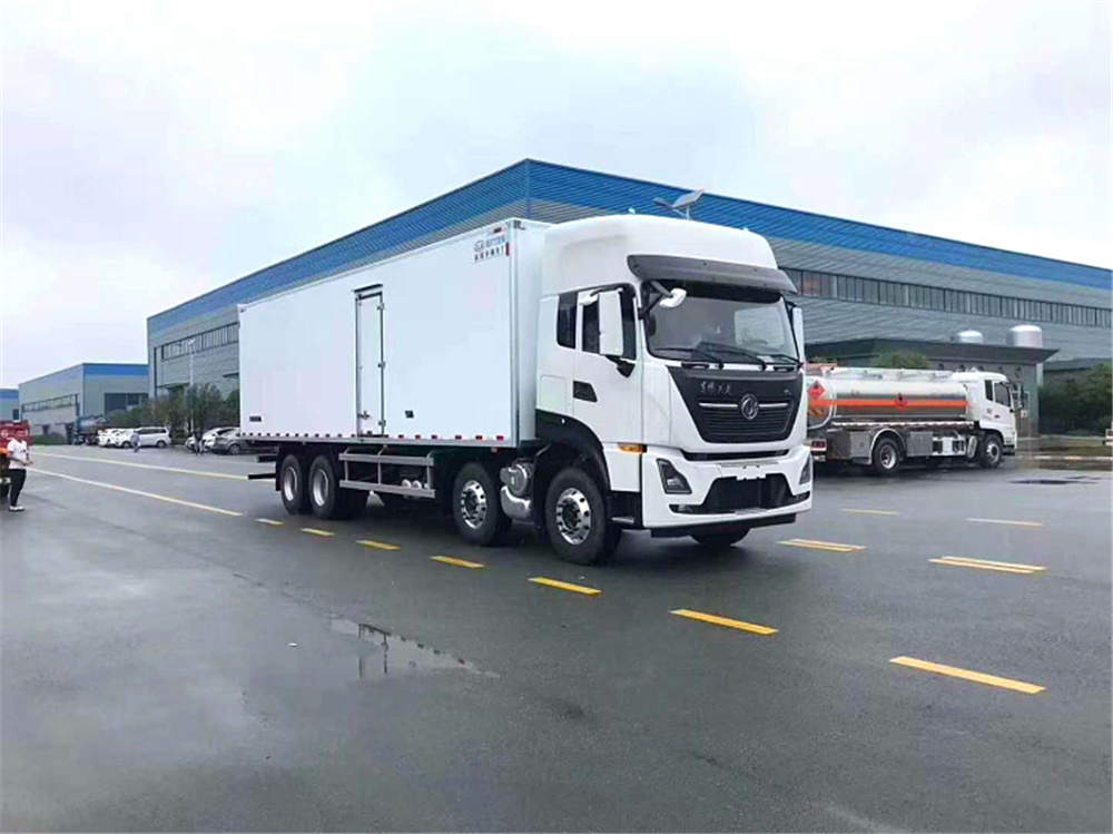 东风天龙KL系列前四后八冷藏车是一款厢体长度9.6米冷藏车型,搭载了沃尔沃技术的东风商用车生产的龙擎DDi11E465-60发动机,从产品的可靠性和技术成熟度来说,都得到了市场的验证。配置为:D320-H高顶双卧车身、四点气囊悬浮驾驶室(液压电动翻转),东风14档变速箱,空调,遥控钥匙+中控门锁,电动升降门窗玻璃,电动调节后视镜,600L+400L铝合金油箱,12R22.5 18PR真空胎,5/10T前后桥,300×80×8车架断面,定速巡航,ABS,气囊座椅,多媒体屏,GPS卫星定位功能的行驶记录仪车载终端,自动调整臂。