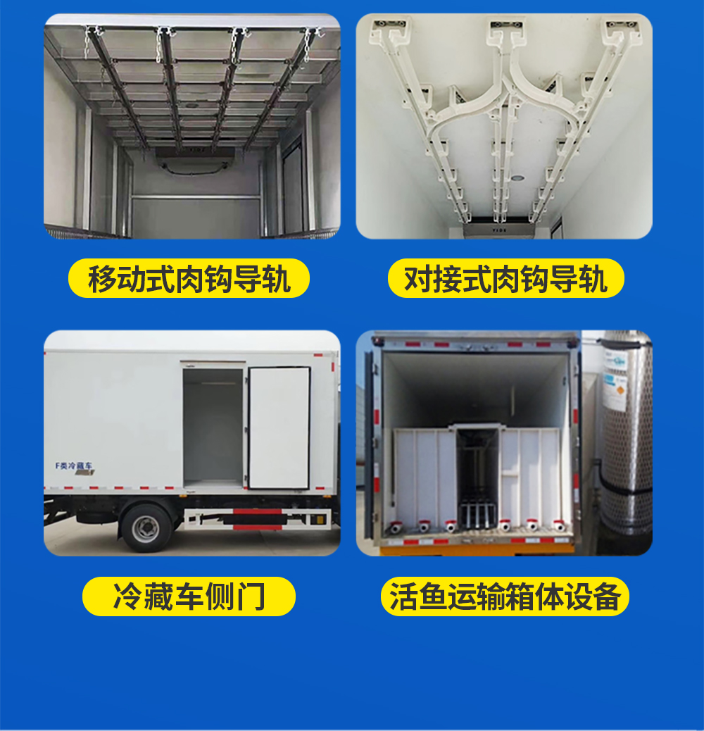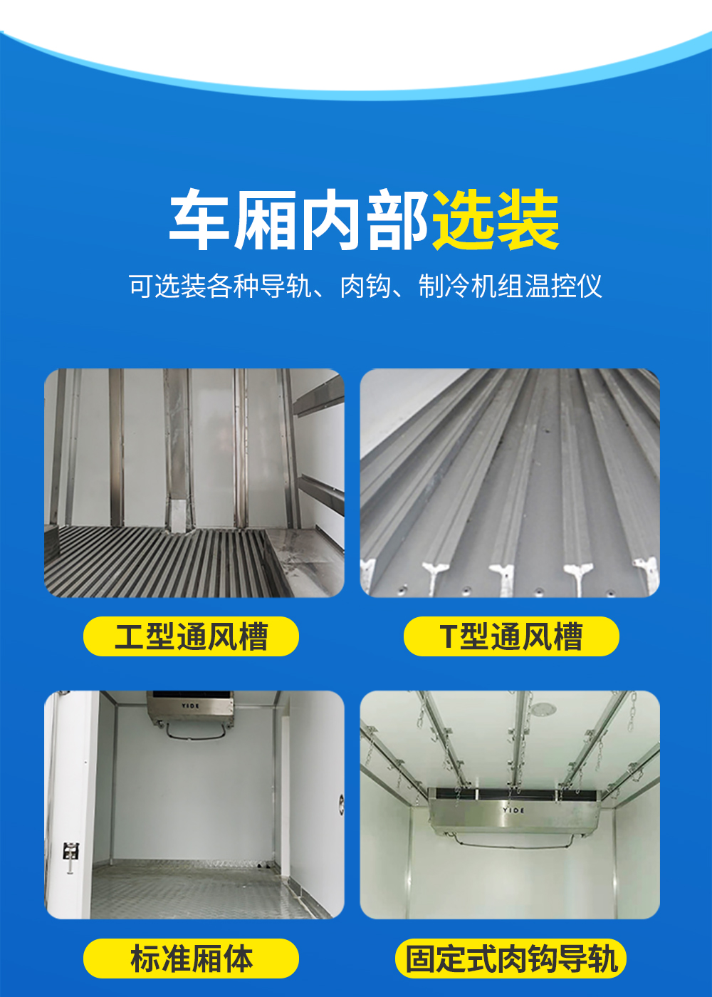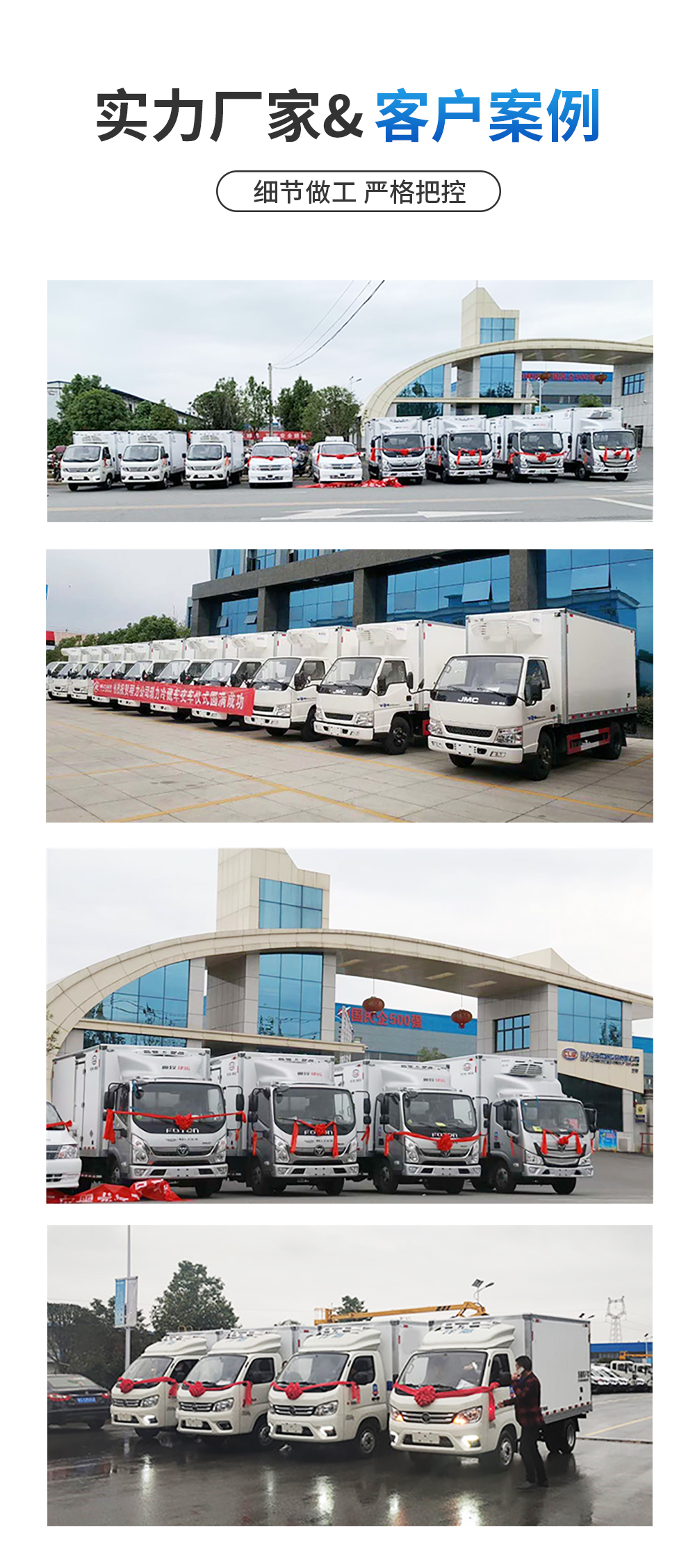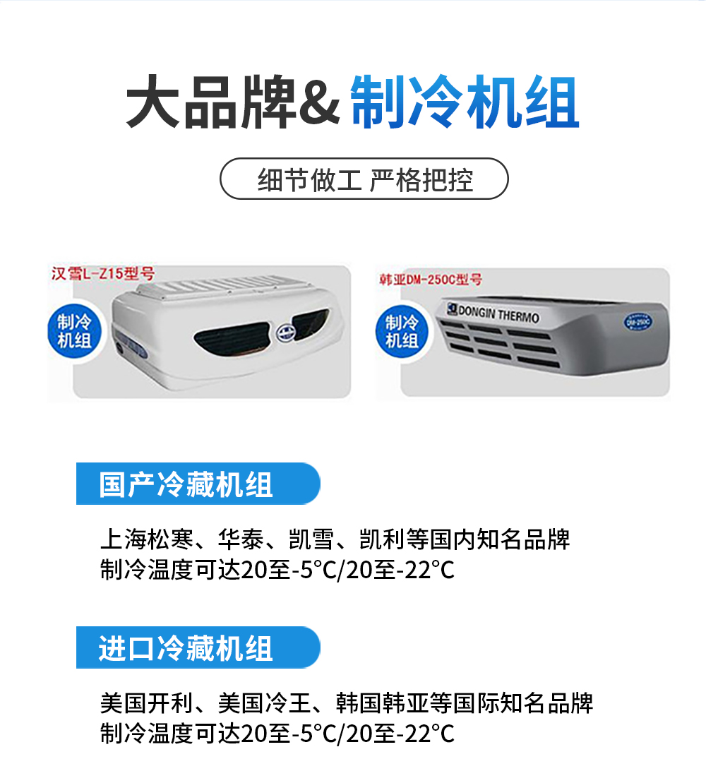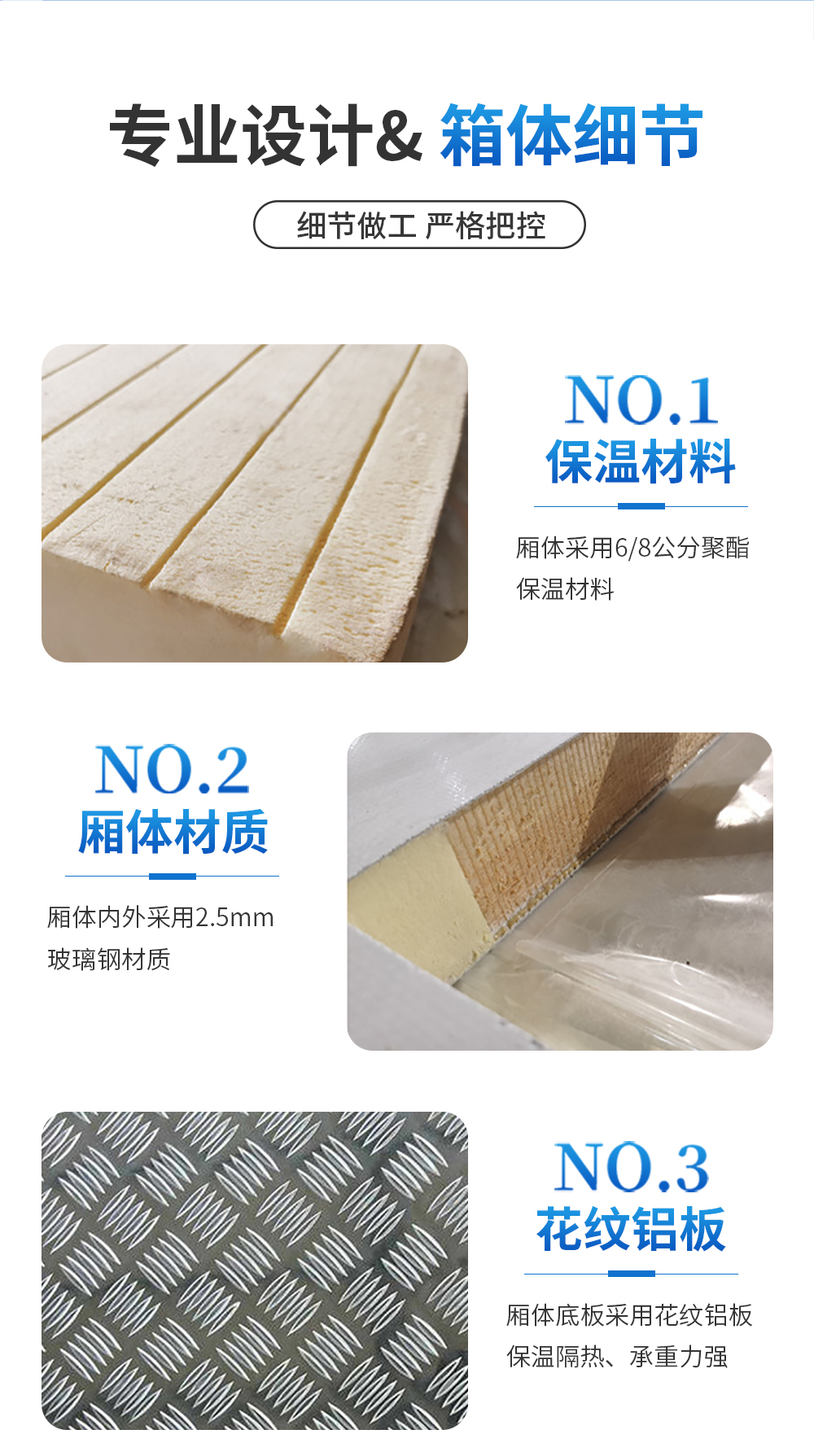 采用国际最先进的1200吨真空吸附一体成型制造。通用三明治断桥隔热工艺,内外壁板选用国内优质的机制1.8mm玻璃钢,厢体厚度80mm,门框厚度80mm,底板上面整体铺铝花纹板,高强度粘合剂,箱体真空吸附8小时以上,确保箱体一次成型,杜绝箱体起包,脱胶。厢体周边3mm加厚型铝合金包边,不锈钢包角,304不锈钢门锁,不锈钢一体式门框,加大型防碰撞胶皮,厢内LED节能照明灯。可选-5°至-18°制冷机组.