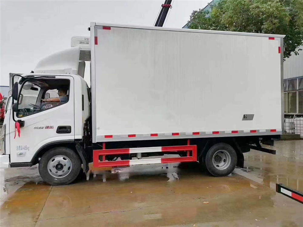 厢板材质:内外壁板选用国内优质玻璃钢(不吸光、隔热性好、硬度强、抗氧化);中间保温层选用8CM厚冷藏专用聚氨酯保温材料。地板采用铝花纹板,门边条采用迷宫式橡胶密封条。厢体配件:厢体周边铝合金包边,不锈钢包角,不锈钢门锁,不锈钢门框及合页,厢体内节能LED照明灯。单开或者双开侧门,肉钩导轨,通风槽,温湿度记录仪。