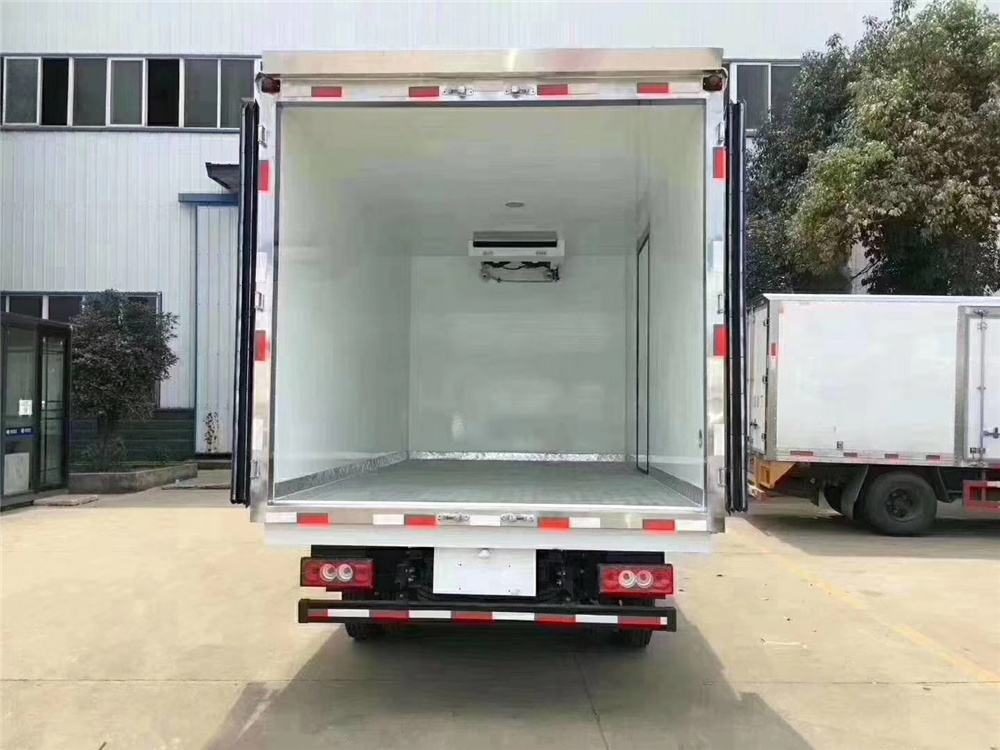 箱体采用的是现在最新工艺《新断桥隔热工艺/整体结构保温厢》内外面料采用 2.5mm厚新式哑光玻璃钢板蒙皮(不吸热),夹心为XPS环保可回收聚氨酯保温材料,全密封双组合环保型聚氨酯胶粘连;厢体底部为铝合金防滑耐磨花纹板材料;侧板+顶板:龙骨为钢骨架+松木隔温;厢体内外部不锈钢包角,铝合金包边(304不锈钢铆钉加固),内部装有LED 照明灯及厢体示宽灯,前端加装两个排水孔;后门框为加厚不锈钢门饰、不锈钢合页及锁件;副梁为Q510 车用大梁钢,箱体与副梁用压板锁紧。