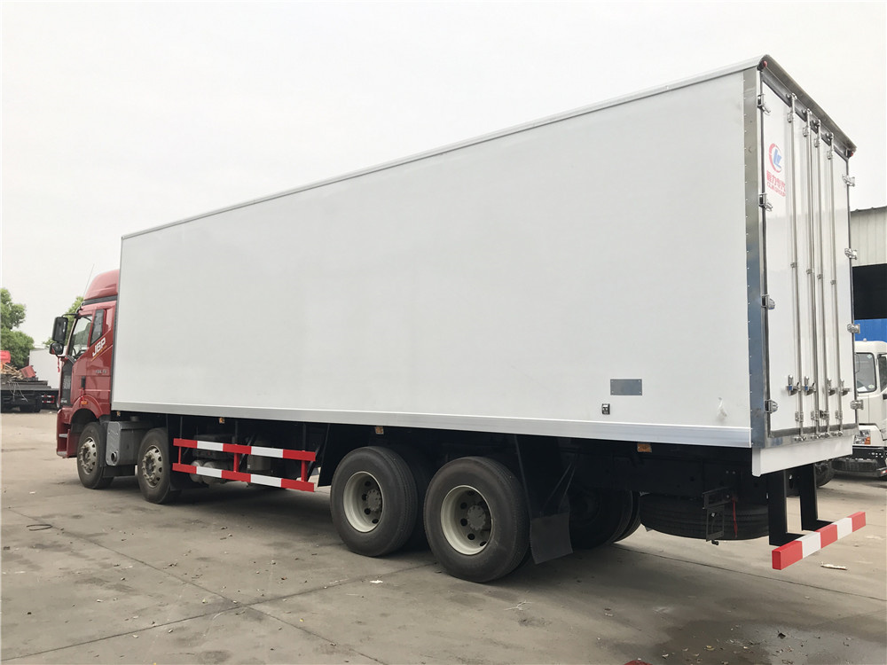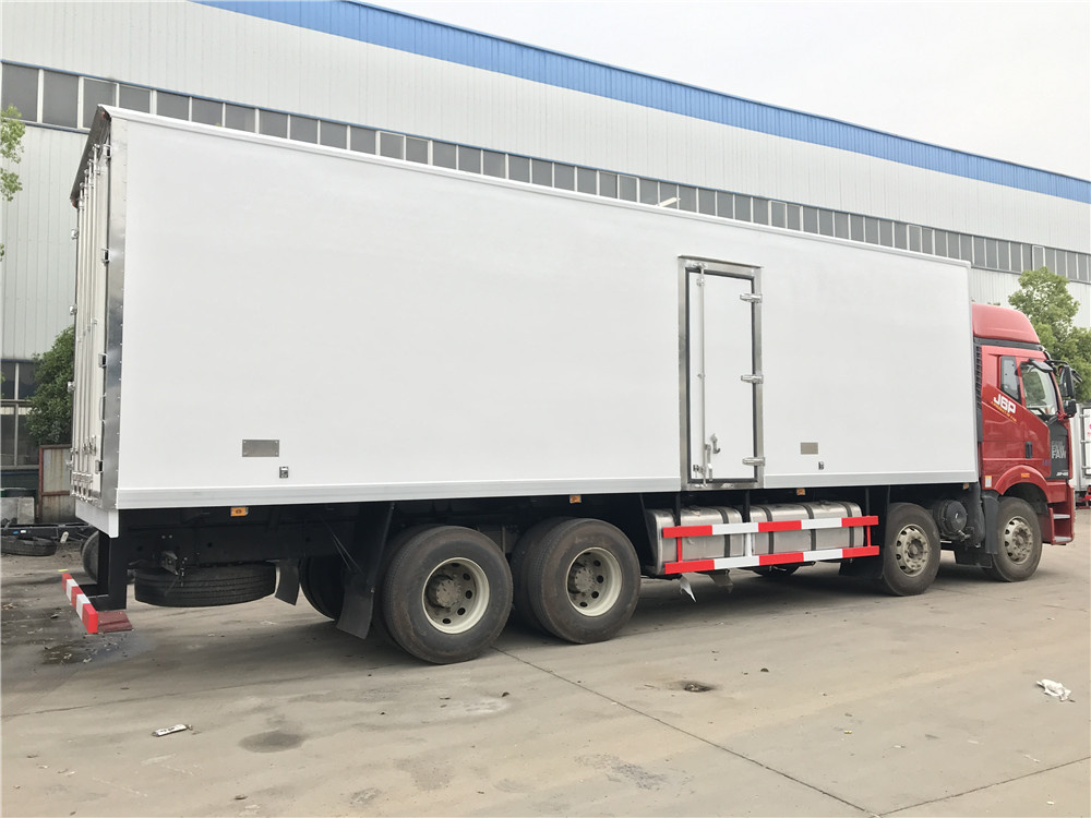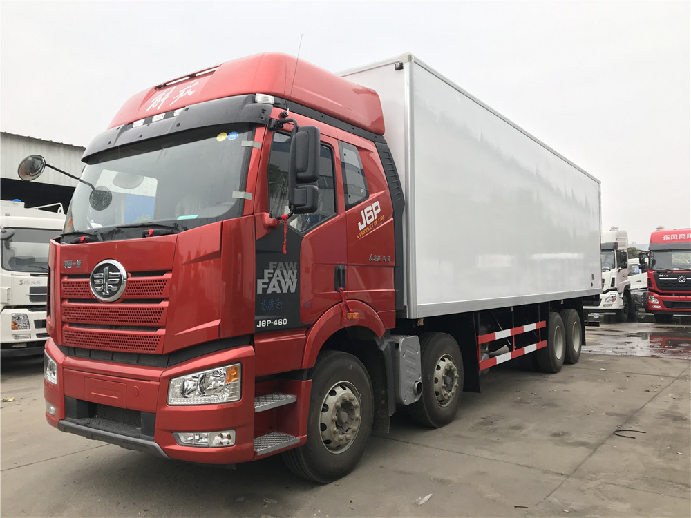 解放J6P前四后八冷藏车是一款重型冷链运输车,厢体长度9.6米,四轴车型,8×4驱动,搭载一汽解放锡柴460马力发动机。配置:J6P大排半高顶双卧驾驶室,四点气囊悬浮车身,12档变速箱(全铝壳体),435冲焊桥(自动调整臂)、ABS、12R22.5型18层级真空胎,自动空调,600L油箱,电动液压举升装置,电动玻璃升降,电动后视镜,单DIN北斗兼容车载系统,10寸多媒体影音大屏,发动机十万公里长换油周期。