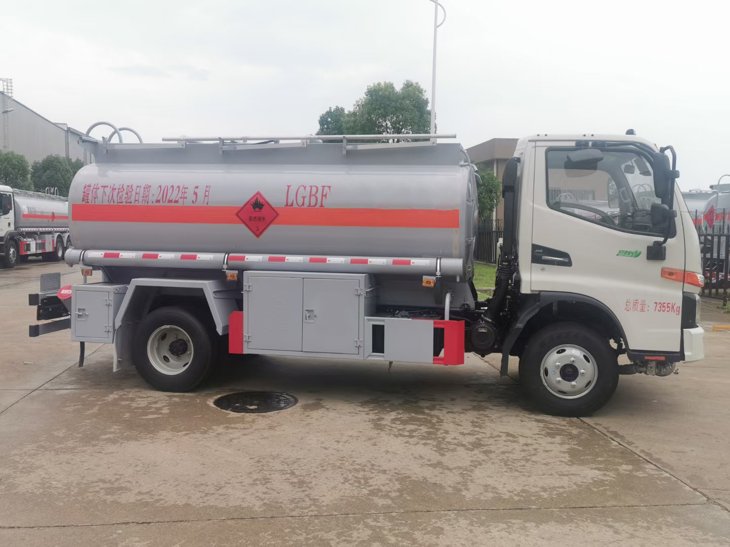 | 整车说明: | 1、该车适用于危险品运输,运送危险货物车辆类型为:FL型,类项号:3。罐体有效容积4.4立方米,罐体外形尺寸(长×宽×高)(mm):3800×1600×1050,罐体上部选装上走道,选装弧形挡泥板。加油机型号及生产企业:BL1111Z/珠海市贝林加油设备有限公司中山分公司,HS1812B/托肯恒山科技(广州)有限公司,SKES-1112/恒和嘉华科技有限公司(上海伯莱机械有限公司),SK20QF-111A、SK20QF-222A/郑州三金石油设备制造有限公司,CS20D1110F/正星科技有限公司,JSK-70B1121CZ,JSK-70B1121C,JSK45B1121C/稳恩佳力佳(北京)石油化工设备有限公司, ZH6444/佛山市众泽机电科技有限公司, XTST121BF1/邢台正润通科技发展有限公司,TA-1111KFJ/沈阳航天新阳机电有限公司。2、侧、后防护材料均采用Q235,螺栓连接,后防护截面尺寸(mm)100×50,下边缘离地高440mm。3、仅选用排气管前置、限速装置(限速80km/h)、前轮盘式制动及子午线轮胎的底盘,安装带有卫星定位功能的行驶记录仪。转向轮安装轮胎防爆应急防护装置。ABS型号/生产企业:CM4XL-4S/4M,VIE ABS-Ⅱ/广州瑞立科密汽车电子股份有限公司,浙江万安科技股份有限公司。选装ETC。 | ||